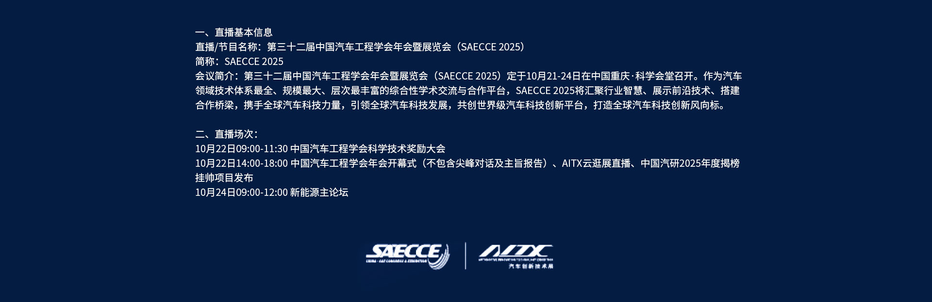 中国汽车工程学会年会开幕式(不包含尖峰对话及主旨报告)、AITX云逛展直播、中国汽研2025年度揭榜挂帅项目发布